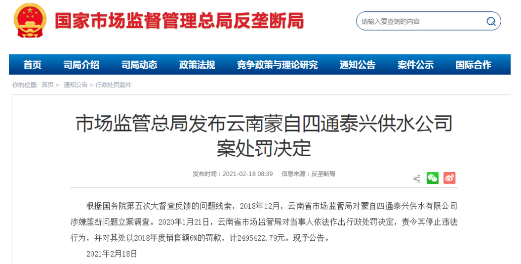 根據(jù)國(guó)務(wù)院第五次大督查反饋的問題線索,2018年12月,云南省市場(chǎng)監(jiān)管局對(duì)蒙自四通泰興供水有限公司涉嫌壟斷問題立案調(diào)查。2020年1月21日,云南省市場(chǎng)監(jiān)管局對(duì)當(dāng)事人依法作出行政處罰決定,責(zé)令其停止違法行為,并對(duì)其處以2018年度銷售額6%的罰款,計(jì)2495422.79元。