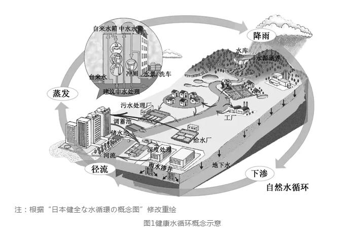 2014年至今,日本城市水系統(tǒng)進(jìn)入了體系優(yōu)化階段,這一階段最顯著的特點(diǎn)是健康水循環(huán)理念得到前所未有的重視,城市水系統(tǒng)工作從要素治理向系統(tǒng)綜合整治轉(zhuǎn)變。事實(shí)上,日本很早就開(kāi)始重視水循環(huán)的重要作用,2000年制定的《全國(guó)綜合水資源計(jì)劃》(又稱“21世紀(jì)水計(jì)劃”)就提出了構(gòu)筑可持續(xù)的用水體系,適應(yīng)循環(huán)型社會(huì)發(fā)展的要求,但由于種種原因,這一理念在涉水工作發(fā)展進(jìn)程中并未被完全落實(shí)。隨著日本經(jīng)濟(jì)社會(huì)發(fā)展模式的轉(zhuǎn)變,人口老齡化和氣候變暖等多種因素的影響,加以城市水資源、水環(huán)境、水安全問(wèn)題仍舊凸顯,日本的城市規(guī)劃建設(shè)者開(kāi)始意識(shí)到城市水系統(tǒng)是城市復(fù)雜大系統(tǒng)的重要組成部分,涉及城市水資源開(kāi)發(fā)利用、水環(huán)境治理保護(hù)、水安全保障提升等全要素全過(guò)程,局部的涉水工作難以解決整體問(wèn)題,需要用系統(tǒng)的思維來(lái)認(rèn)識(shí)和分析面臨的水問(wèn)題,以城市為核心構(gòu)建健康水循環(huán)才能實(shí)現(xiàn)城市水系統(tǒng)對(duì)經(jīng)濟(jì)社會(huì)的永續(xù)支撐(見(jiàn)圖1)。