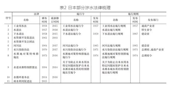 日本的法律體系可以分為憲法、法律、政令、省令和通達(dá)5個(gè)層次。通過(guò)國(guó)會(huì)頒布法律、內(nèi)閣頒布政令以及省頒布省令,對(duì)涉水工作進(jìn)行全面的規(guī)定(見(jiàn)表2)。例如國(guó)會(huì)頒布《河川法》,內(nèi)閣負(fù)責(zé)發(fā)布《河川法施行令》,主管河道的國(guó)土交通省負(fù)責(zé)發(fā)布《河川法施行規(guī)則》。整個(gè)法律體系層次清晰、責(zé)任明確、詳略互補(bǔ),全方位指導(dǎo)涉水工作的開(kāi)展。日本城市水系統(tǒng)相關(guān)法律較為豐富,核心的涉水法律有《河川法》《水資源開(kāi)發(fā)促進(jìn)法》《水道法》《下水道法》《水污染防治法》等10余部,覆蓋了河流水系、水資源、供水、用水、排水、水環(huán)境和健康水循環(huán)理念等水系統(tǒng)多角度、全要素的內(nèi)容。日本涉水法律內(nèi)容詳盡,明確涉水工作的責(zé)任主體、職能分工、協(xié)調(diào)機(jī)制,部分法律還對(duì)技術(shù)標(biāo)準(zhǔn)進(jìn)行詳細(xì)規(guī)定,例如《水道法》將水質(zhì)基準(zhǔn)的內(nèi)容納入法律框架體系,強(qiáng)化了標(biāo)準(zhǔn)執(zhí)行力度。日本涉水法律體系修訂更新周期短,如有必要最短1年時(shí)間即可開(kāi)展法律修訂,例如《下水道法》在2005年、2011年和2015年分別針對(duì)城市內(nèi)澇、事權(quán)改革、雨水公共下水道建設(shè)問(wèn)題開(kāi)展修訂,極大的保障了法律的適應(yīng)性。