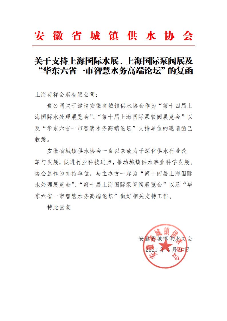 為幫助安徽省水務企業(yè)進一步開拓市場,促進國內外企業(yè)之間的經貿合作與技術交流,安徽省城鎮(zhèn)供水協(xié)會決定將全力支持 2021 年 6 月 2 日在上海國家會展中心(虹橋)舉辦的2021華東六省一市智慧水務高端論壇,與主辦方上海荷祥會展有限公司攜手為城鎮(zhèn)水務行業(yè)搭建一個國際性商貿交流平臺,助力企業(yè)更好的抓住行業(yè)機遇,積極促進我國城鎮(zhèn)水務行業(yè)在"十四五"期間獲得快速發(fā)展。