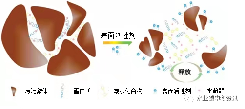 表面活性劑具有和聚丙烯酰胺類似功能,可以用作脫水助劑,能大幅度降低濾餅水分含量。具體來說,表面活性劑親水基團會與蛋白質結合,從而損害生物膜功能性和完整性;而疏水基團與脂質結合,可導致膜液化、損害其屏障特性。與此同時,表面活性劑攜帶的電荷效應會在一定程度上中和污泥表面電荷,降低污泥之間靜電斥力,使污泥絮體變得松散;表面活性劑也會增加細胞疏水性,促進細胞與細胞之間的相互作用,進一步誘導污泥絮體從親水性液相中脫出,從而提高沉降速率和脫水性能。