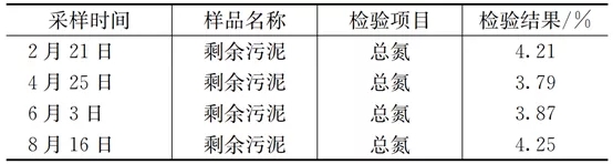 微生物在生長繁殖過程中,會攝取污水中一部分氮來合成自身細胞組分,采用《城鎮污水處理廠污泥檢驗方法》(cj/t 221-2005)第49章中的方法對剩余污泥中氮含量進行檢測,檢測時間為2020年,檢測結果見表1。