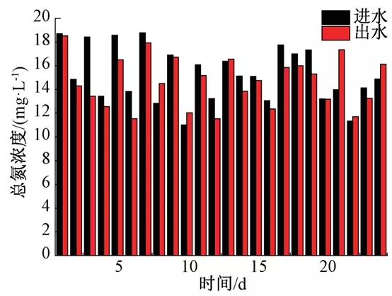 再生水廠以3.75萬m3/d規模生物池為研究對象,控制該生物池污泥濃度為6 500 mg/l、水溫23 ℃、混合液回流比為500%、生物池好氧區前、中、后段do分別為1.5 mg/l、1.2 mg/l以及0.5 mg/l。對好氧段進出水的總氮濃度變化進行檢測,結果如圖1所示。