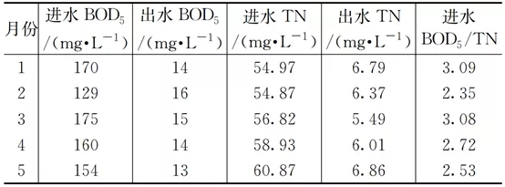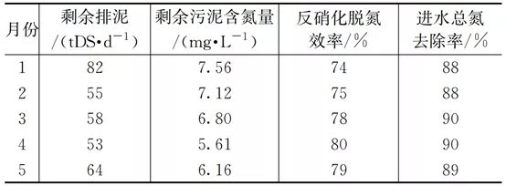 然而在實際運行過程中,受回流液中do濃度的影響,反硝化效率很難達到理論值。如表2所示,再生水廠2021年1月至5月進水bod5/tn的平均值為2.75,低于2.86的理論值。日常該水廠生物池內回流比為350%左右,按照式(2)計算理想狀態下的脫氮效率為78%,在未投加外加碳源的情況下生物系統實際反硝化脫氮效率為77%(見表3)??紤]剩余污泥排放中攜帶的氮含量,進水總氮平均去除率為89%。
