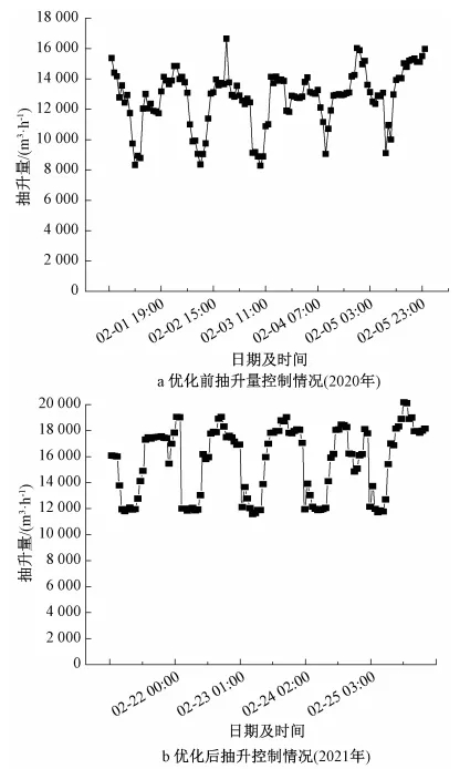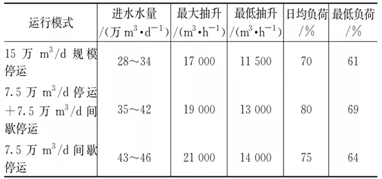 再生水廠結合來水時變化及日變化規律,通過生物池及膜池間歇停運的方式(見表4),提高日水力負荷至70%以上。并充分利用上游污水管網調蓄功能,控制瞬時最低抽升量不低于運行曝氣池負荷的60%(見圖3b)。
