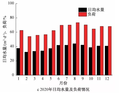 受城市生產活動的影響,污水處理廠在實際運行過程中不同時段、季節來水水量呈規律性波動。水力負荷過低或水量時變化系數過大對回流液do濃度、內回流比等脫氮重點指標控制會帶來一定困難。以再生水廠2020年來水情況為例,水量峰谷差值比例超過50%(見圖3a),瞬時最低負荷僅為設計值的30%。不同月份水量差異也較為明顯,最低負荷僅為設計值的53%(見圖3c)。