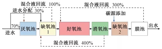 本文從物料平衡的角度出發,對某水廠脫氮過程的關鍵控制因素進行研究,并結合配水優化、水力負荷控制、內回流消氧等多種工藝管控手段,開展某大型全地下mbr再生水廠低碳氮比下零碳源投加脫氮工作的探索與實踐。
