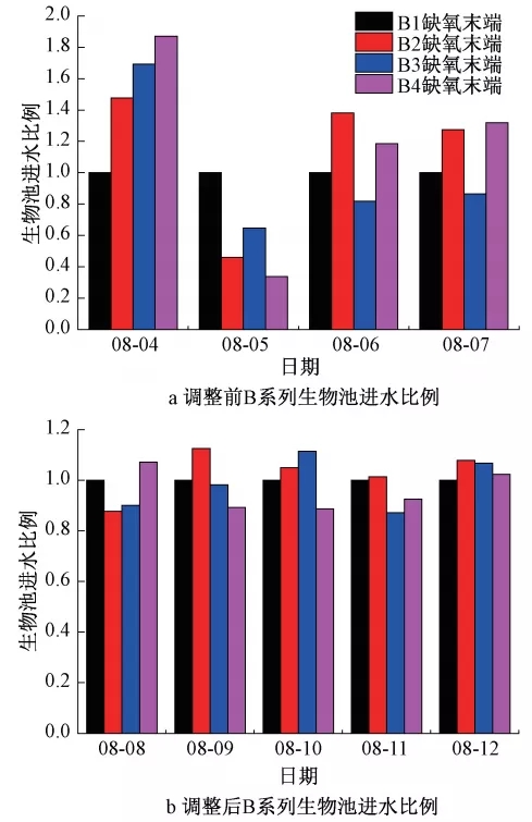 如圖5所示,開展配水優化工作后,各生物池間進水均勻度明顯提升,同一系列各生物池間進水比例差值由33%降低至15%左右。