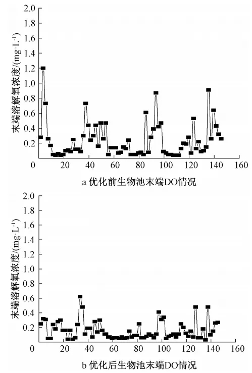通過配水優化、抽升控制、生物池倒運等方式,穩定生物池水力負荷。優化后,生物池do穩定性明顯提高(見圖6b),末端do濃度基本低于0.5 mg/l,滿足反硝化對于do濃度的要求,同時大大降低了回流液中的do對于進水碳源的浪費。