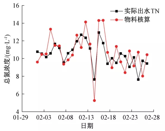 以再生水廠2020年2月份的實際出水tn與物料平衡方程模擬出水tn進行對比,結果如圖7所示。