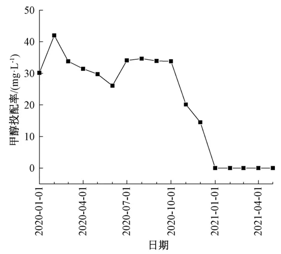 (4) 通過建立氮的物料平衡模型,對工藝運行參數進行過程控制,再生水廠甲醇投配率逐漸降低,于2021年實現了碳源零投加。