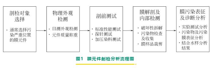 膜元件剖檢分析流程主要包括對膜元件的選擇、檢測和分析,具體是指剖檢對象選擇、物理外觀檢測、剖前測試、膜解剖及內(nèi)部檢測、膜污染表征及診斷分析五個步驟。圖1是膜剖檢分析流程圖。