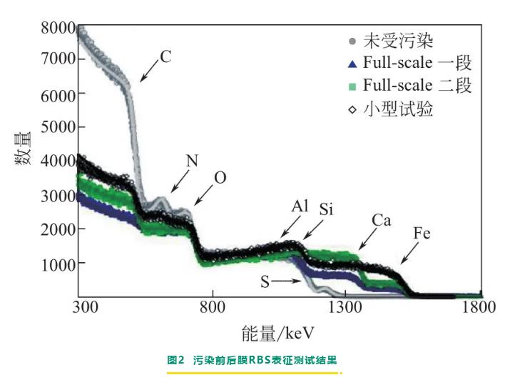 無機污染主要是由水中存在的無機鹽在膜表面逐漸累積,最終形成的無機垢所引起的。無機鹽結(jié)垢過程較復雜,常存在多種無機鹽的共沉淀和相互作用。sem、eds、xrd等結(jié)構(gòu)表征和膜表面滴酸測試是常用的無機污染診斷手段。ruiz-garcía等對用于苦咸水脫鹽運行11年的反滲透膜元件進行了剖檢分析,剖檢對象選擇的是四種不同位置的膜元件,分別包含一段和二段反滲透系統(tǒng)的首末支膜。其中一段的第一支膜可以直觀地看到有褐色沉積物,二段的最末支膜可以看到有粗糙的黃色垢,經(jīng)sem-eds表征及膜表面滴酸分析,得出膜污染物主要是含有碳酸鈣和硅鋁酸鹽的無機污染。xps是常用于表征膜表面元素組成和化學結(jié)構(gòu)的分析手段,但xps只能檢測膜皮層頂端,檢測深度一般只有7nm;rbs也可以用于分析膜表面元素組成和結(jié)構(gòu),且rbs檢測深度約2μm,比xps能檢測的深度更深,因此rbs還能用于檢測污染層的厚度。gorzalski等利用rbs研究膜表面污染物情況,對用于含硅地下水處理運行2.5年的納濾膜元件進行了剖檢分析,剖檢對象選擇的是一段和二段納濾系統(tǒng)的首末支膜元件。通過sem、xps、rbs等表征分析,得出膜污染物主要是含有fe、ca、si、al、s元素的無機污染,其中一段膜元件的si和al含量較高,二段膜元件的ca污染較重。表2和圖2是rbs對污染前后膜的表征結(jié)果對比,由rbs結(jié)果可得到xps無法獲得的信息,如不同工段的污染層厚度不同,并且rbs能探測整個污染層,與xps只能探測皮層所得到的si元素含量不同。