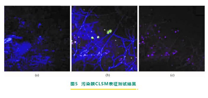 膜污染的形成與進水的水質(zhì)條件關(guān)系密切,因此,對于水質(zhì)成分復雜的廢水處理膜,其膜污染通常還表現(xiàn)為多種污染物的協(xié)同作用。li等對煤化工廢水處理系統(tǒng)苦咸水反滲透裝置的一段和二段ro膜元件進行了剖檢分析。針對每個膜元件樣品,隨機選擇一個膜袋并按照“九宮格”分布,每個部分裁剪10cm×10cm膜片樣本進行進一步分析表征。sem-eds、xps、atr-ftir、3d-eem等表征結(jié)果表明,沿著進水方向從第一段到第二段,有機物污染全程污染嚴重,無機污染逐漸加劇,而微生物污染呈不斷減輕的趨勢。其中有機污染物主要是蛋白質(zhì),無機污染物為ca、fe、si所形成的沉淀物。clsm可以清晰地顯示多種污染物的協(xié)同作用,圖5是clsm表征結(jié)果,圖中藍色代表β-吡喃糖,綠色代表蛋白質(zhì),粉色代表核酸,由圖可見幾種污染物明顯地互相交織在一起,從而得出膜污染存在多糖和鈣離子架橋形成的有機-無機協(xié)同污染。