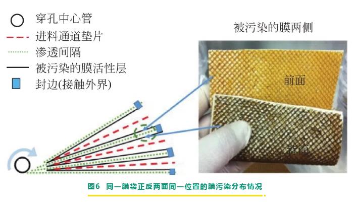 膜解剖是對膜元件進行破壞性拆解后,對膜元件進行相關(guān)內(nèi)部檢測。內(nèi)部檢測主要包括膜袋、膜卷原水進口端、濃水出口端、濃淡水隔網(wǎng)、膜片表面污染物的檢查。一方面可通過膜袋最外側(cè)膜片的折痕判斷產(chǎn)水背壓現(xiàn)象,另一方面通過詳細記錄的污染物顏色、性狀和氣味對膜污染情況進行初判,并對膜樣品和污染物分別進行裁剪和收集,以作后續(xù)分析。