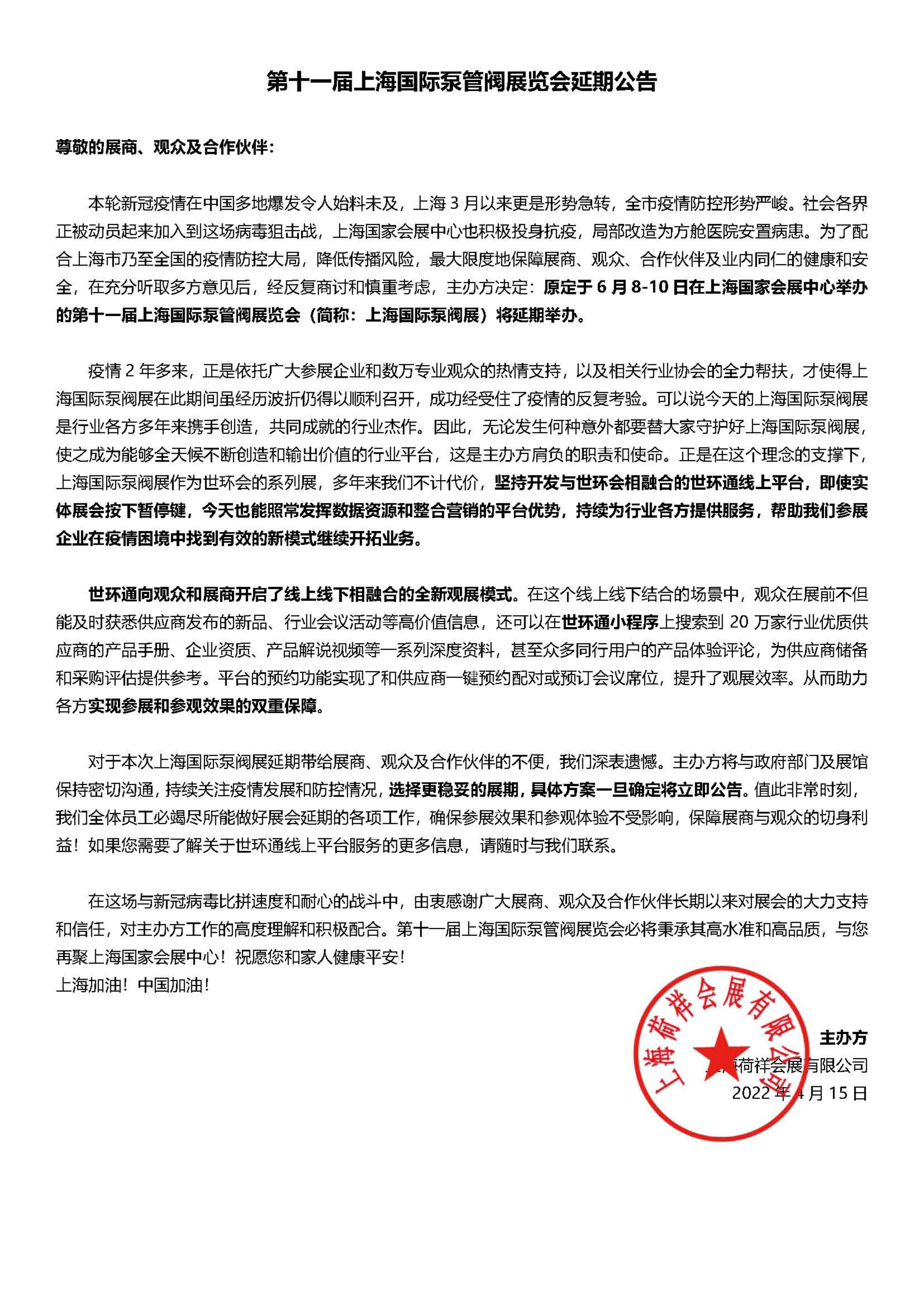 本輪新冠疫情在中國多地爆發(fā)令人始料未及,上海3月以來更是形勢急轉,全市疫情防控形勢嚴峻。社會各界正被動員起來加入到這場病毒狙擊戰(zhàn),上海國家會展中心也積極投身抗疫,局部改造為方艙醫(yī)院安置病患。為了配合上海市乃至全國的疫情防控大局,降低傳播風險,最大限度地保障展商、觀眾、合作伙伴及業(yè)內(nèi)同仁的健康和安全,在充分聽取多方意見后,經(jīng)反復商討和慎重考慮,主辦方?jīng)Q定:原定于6月8-10日在上海國家會展中心舉辦的第十一屆上海國際泵管閥展覽會(簡稱:上海國際泵閥展)將延期舉辦。